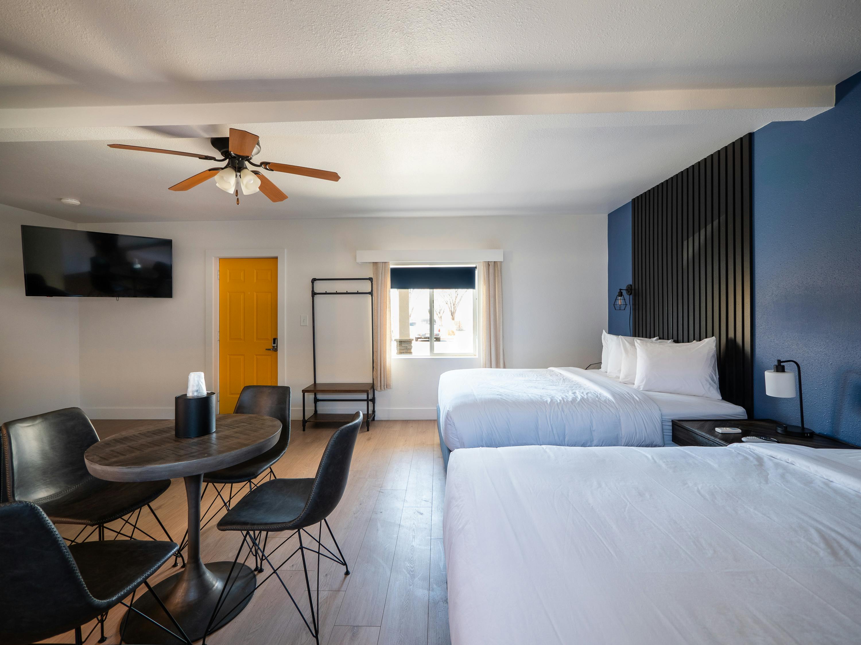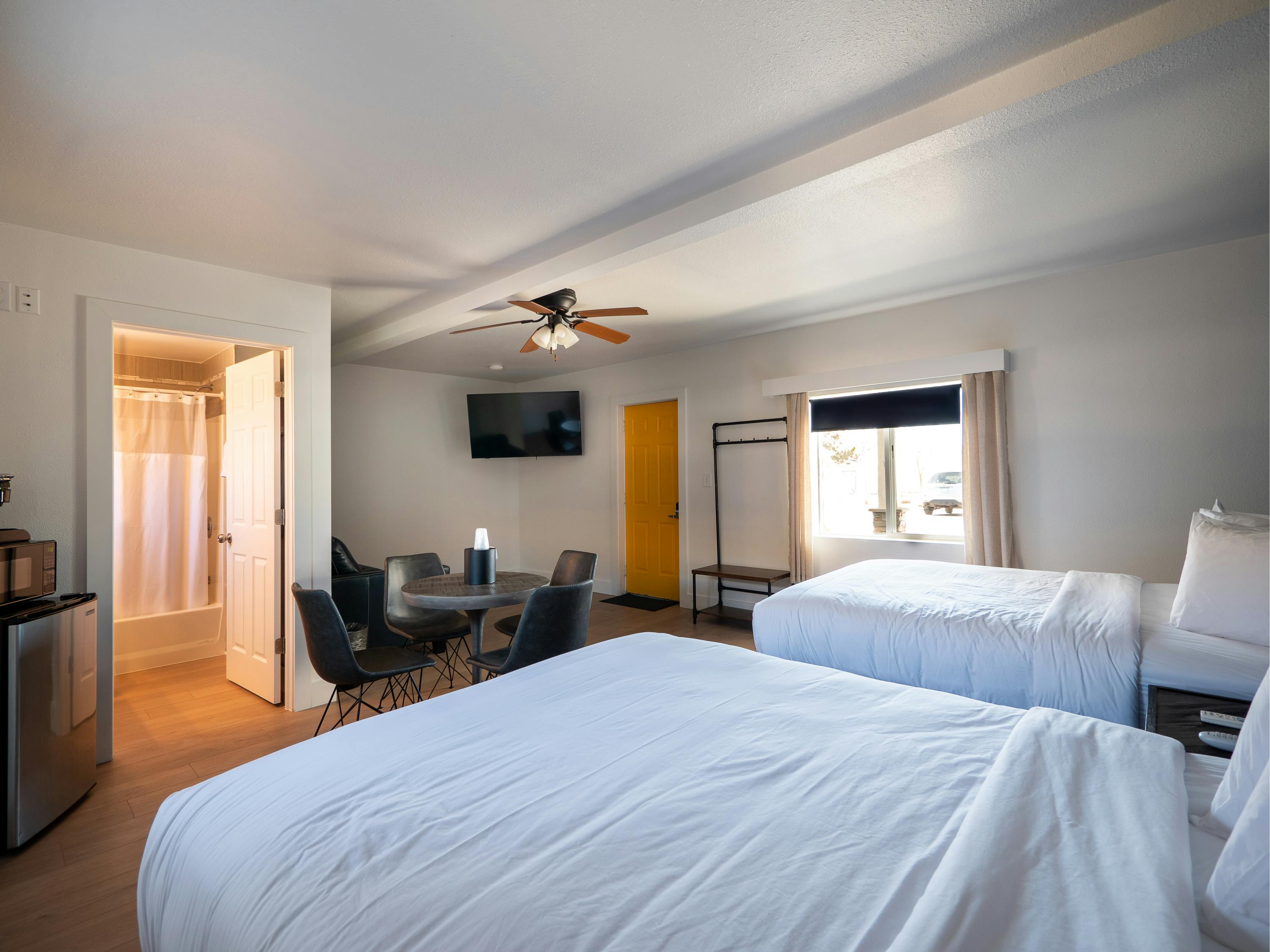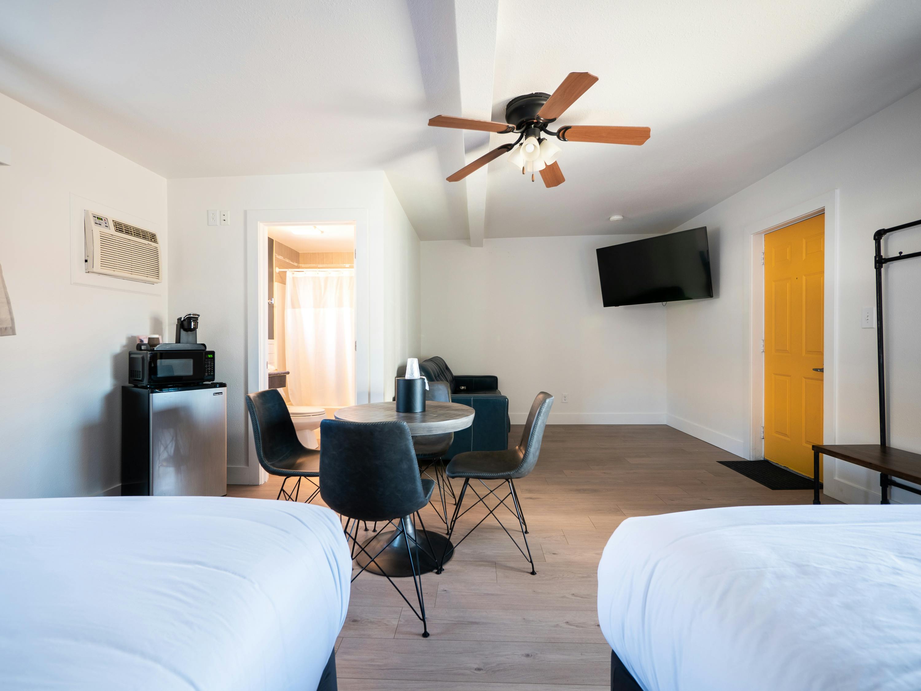 Pack in the whole group! This room features two queen beds and a pull out couch with a memory foam mattress. This is the most spacious of our options. A group table, space for bikes, gig speed WiFi, and cable TV are featured in this air-conditioned room. A microwave, a small refrigerator and a private bathroom are also included.